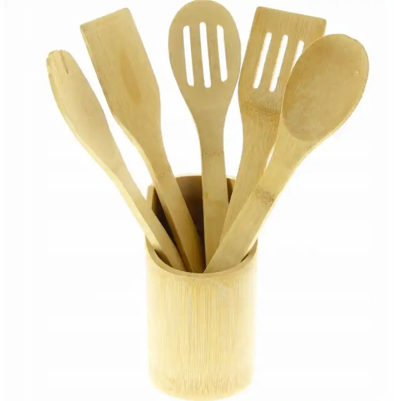 Sada kuchynského bambusového náradia 5 ks v stojane je ekologický, praktický a štýlový doplnok, ktorý zjednoduší každé varenie.