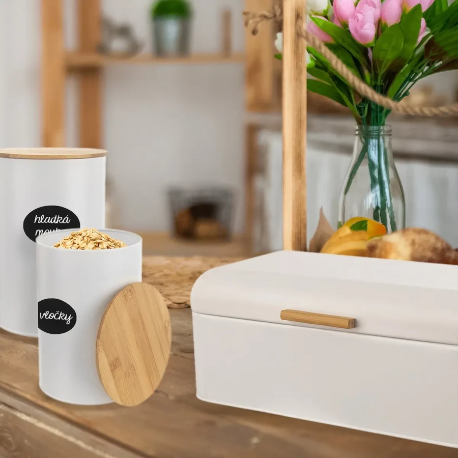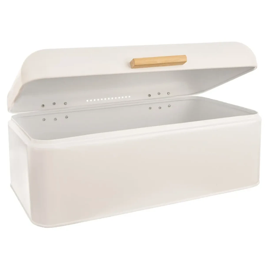 Chlebník WHITELINE – 42×24×16,5 cm, biely plech + bambusové veko, odklápacie veko