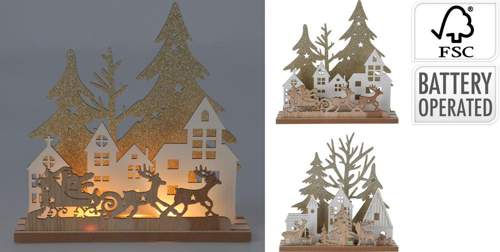 dekorácia dedinka s LED svetlo, materiál drevo, rozmery 19,5x4,5x19,5 cm, 2xAAA batérie nie sú súčasťou, mix typov