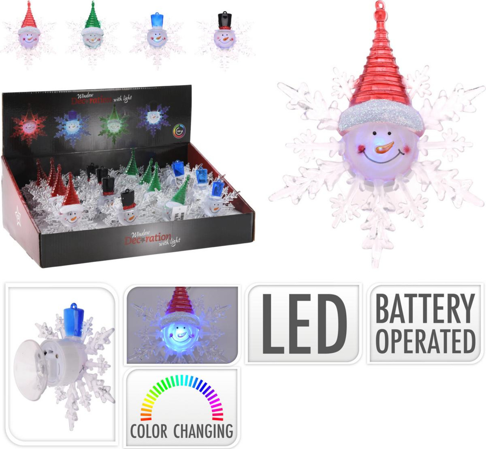 vianočná dekorácia, ozdoba na okno, s prísavkou, vločka, s LED farebným svetlom, materiál plast, rozmer 9,5x4x10/12 cm, na batérie 1x CR2032 (súčasťou), mix