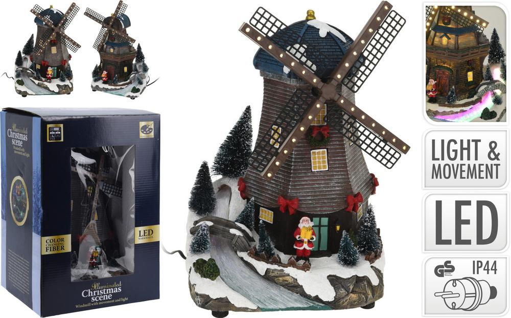 vianočná dekorácia, ozdoba, veterný mlyn, 28 LED teplé biele a vlákno meniace farbu, s pohybom, materiál polystone, rozmer 19,5x17x30 cm, 2 možnosti zapojenia - DC konektor a GS adaptér, mix