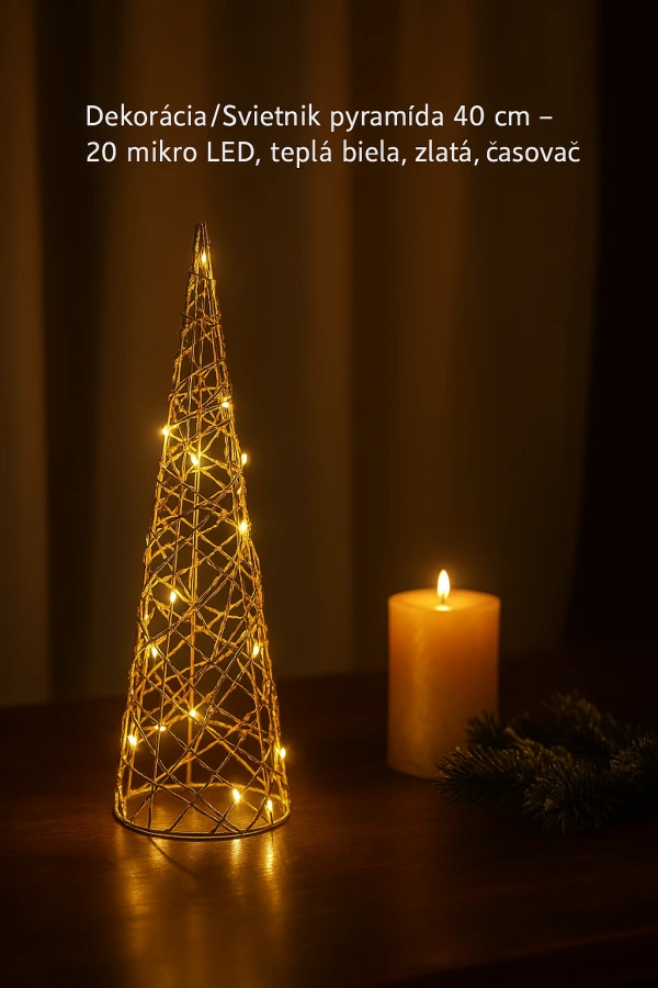 ⭐ Dekorácia / Svietnik pyramída – 40 cm, 20 mikro LED, teplá biela, zlatá