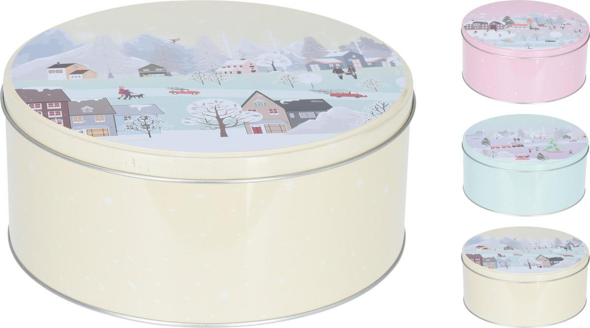 vianočná dóza, na koláče, okrúhla, materiál plech, rozmer 20x20x8,7 cm, mix