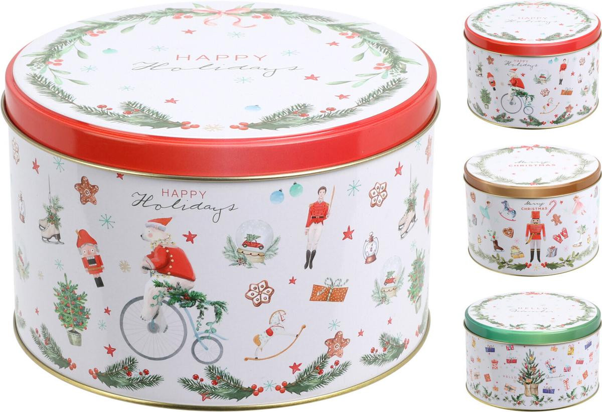 vianočná dóza, na koláče, okrúhla, materiál plech, sada 3 ks - malá 13,5x13,5x8 cm, stredná 15,1x15,1x10 cm, veľká 18x18x12,1 cm, mix