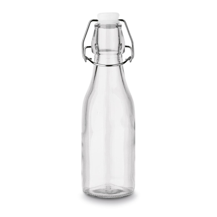 sklenená fľaša, okrúhla, zatváranie pomocou kovovej spony, objem 250 ml, sklo číre, rozmer 6x6x20cm