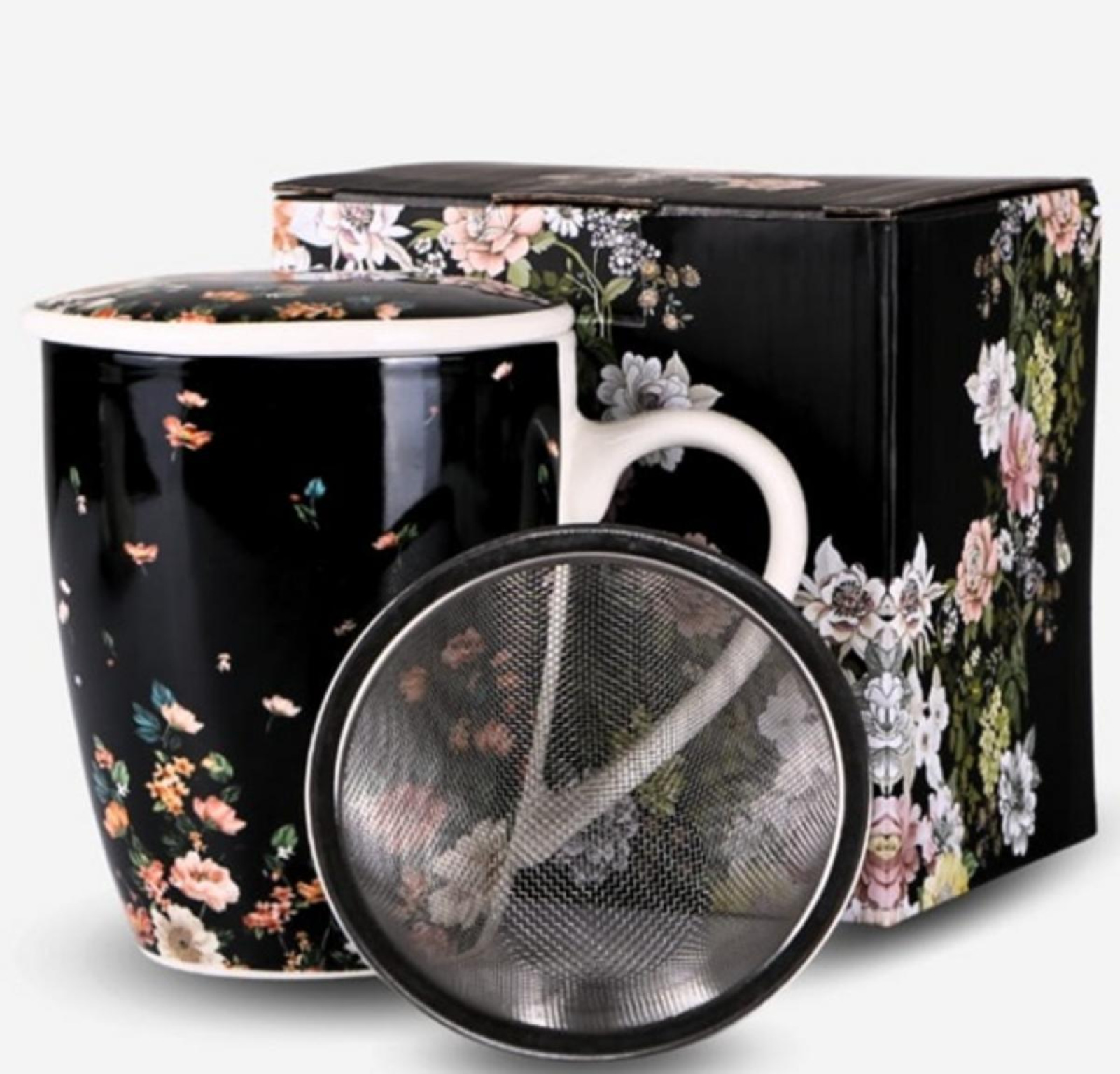 hrnček z porcelánu so sitkom a vrchnákom, objem 360 ml, farba čierna s dekorom kvetov, darčekové balenie