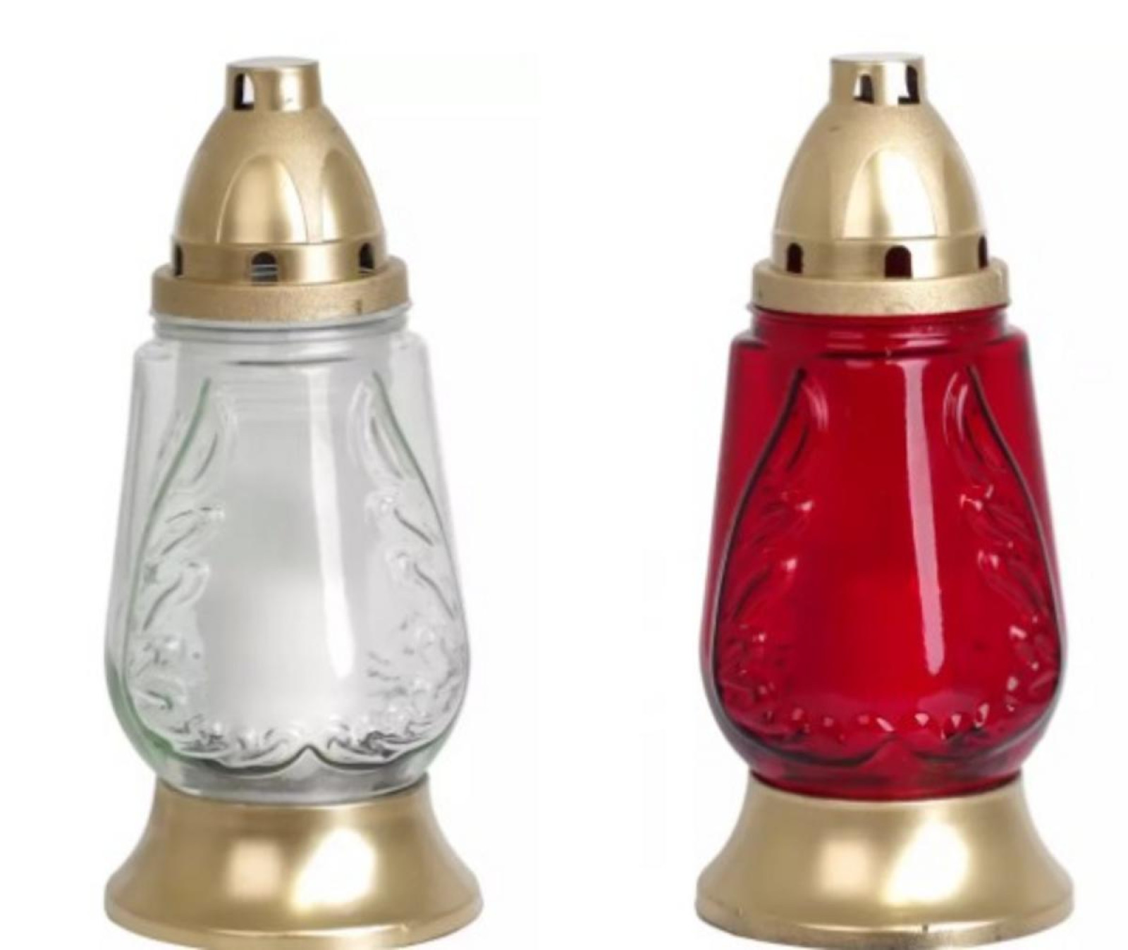 náhrobný kahanec, materiál sklo/plast, výška 24,5 cm, doba horenia 28 hodín, mix farieb