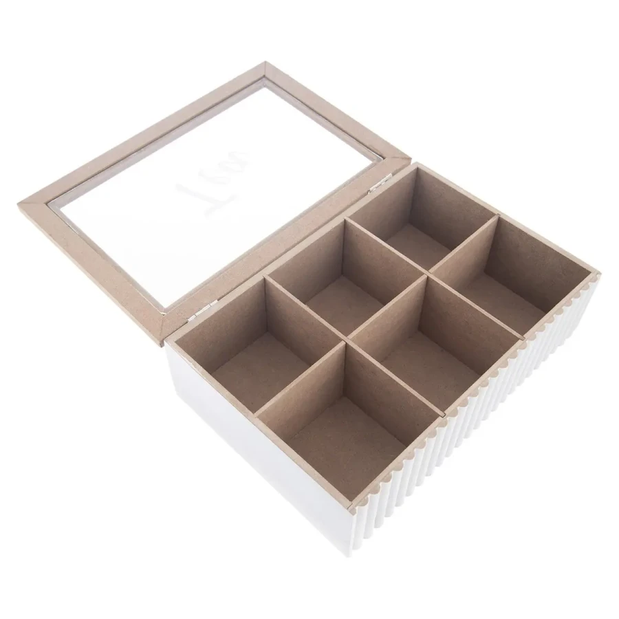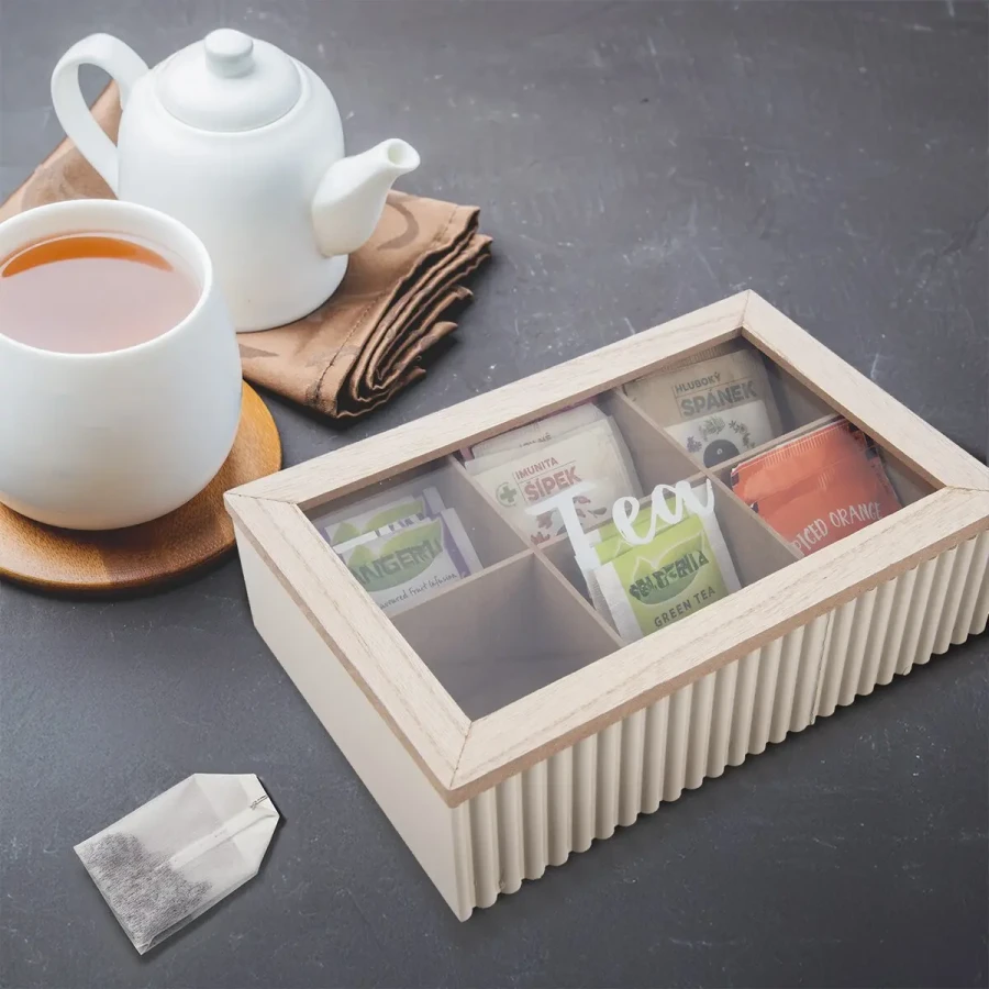 Šesť priehradiek umožňuje ľahké triedenie čajových vreciek podľa druhu či príchute. -