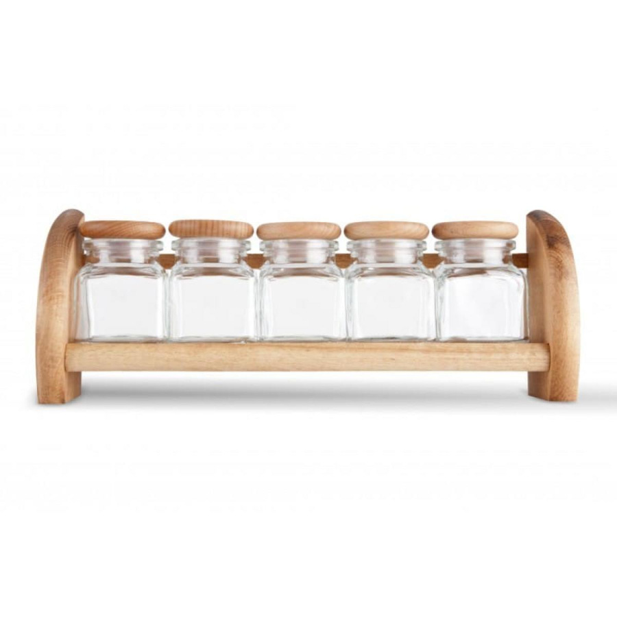 sklenené nádoby na rôzne korenie s dreveným vrchnákom na drevenej poličke, 5 ks