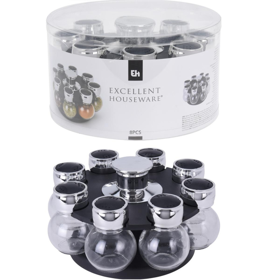 Koreničky sklenné v stojane 8 - dielna sada, materiál stojanu ABS/kov, rozmer stojana: výška 13 cm, priemer 17 cm, rozmer koreničky: výška 8,5 cm, objem 100 ml.