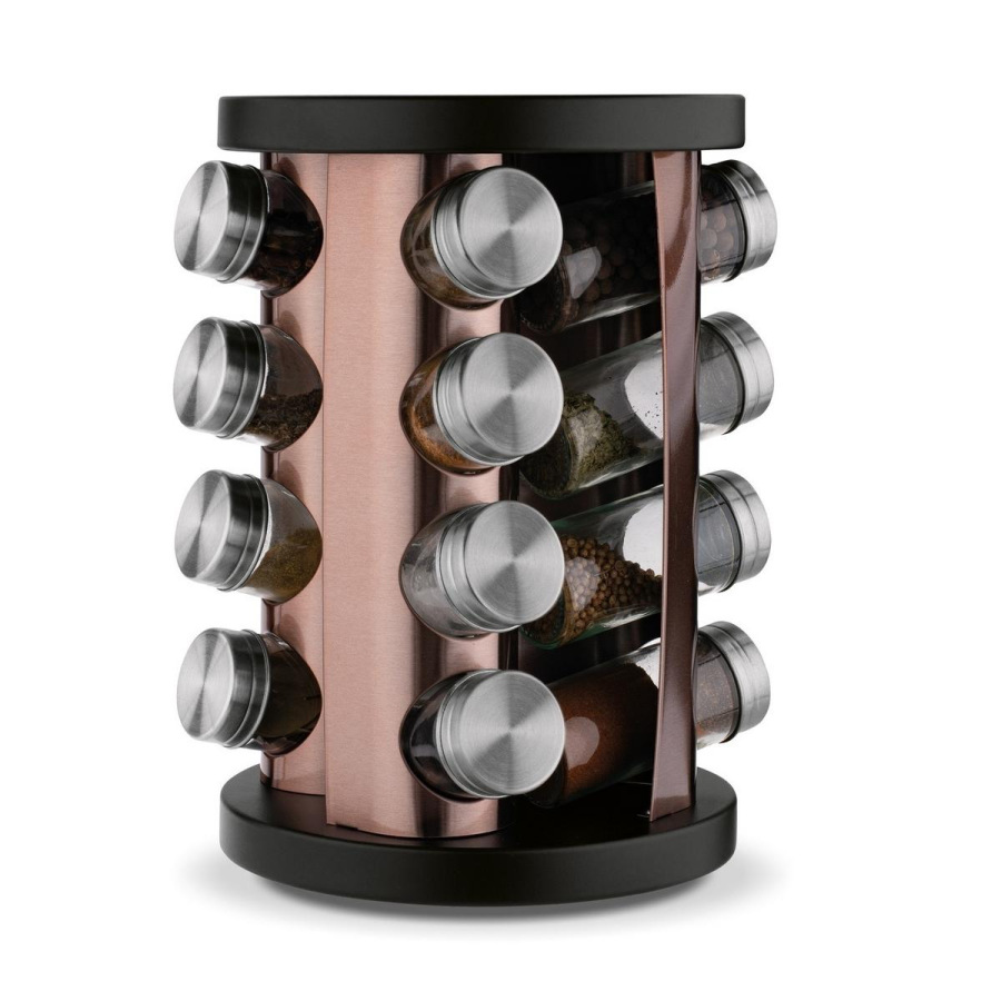 Stojan z nehrdzavejúcej ocele s rozmermi 19x19x28cm obsahuje 16 sklenených koreničiek s objemom 100 ml. Rotačný dizajn produktu umožňuje ľahký prístup ku koreniu.