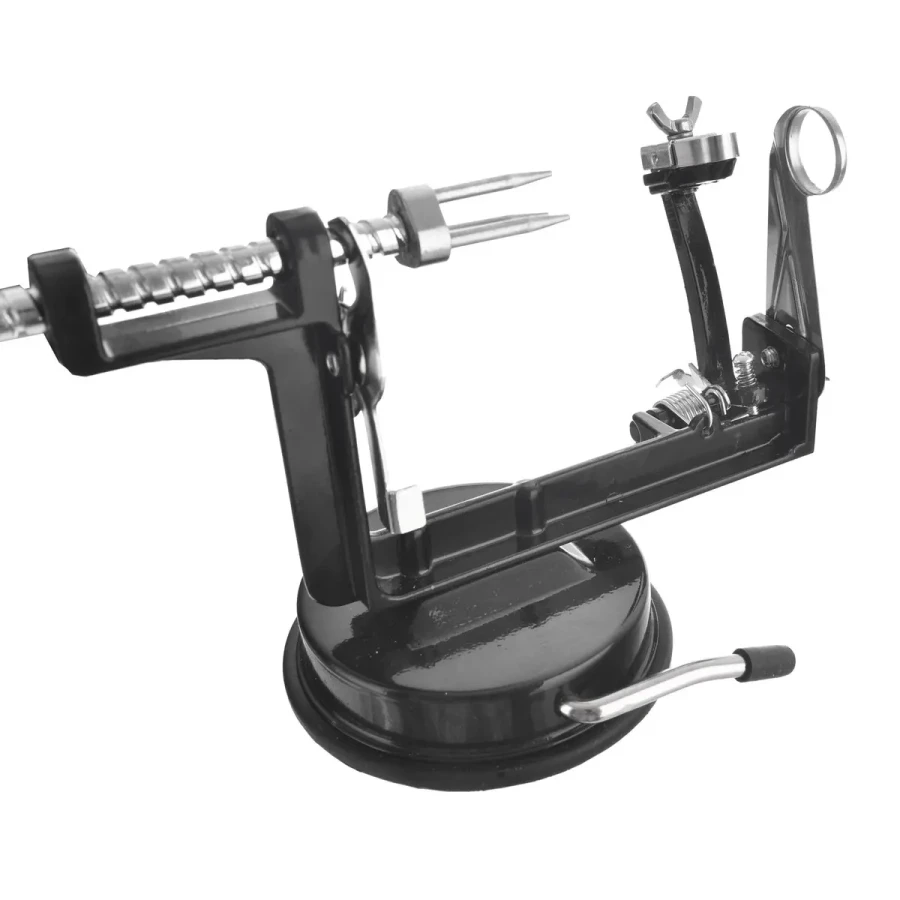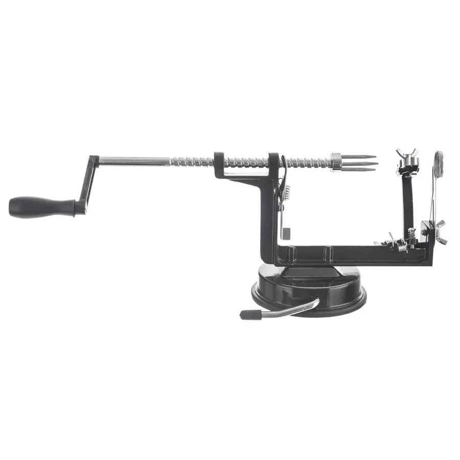 Mechanický strojček na jablká a ovocie je praktický a univerzálny nástroj, ktorý zvládne ošúpať, vykrojiť jadrovník a nakrájať ovocie na špirálu alebo polmesiace.