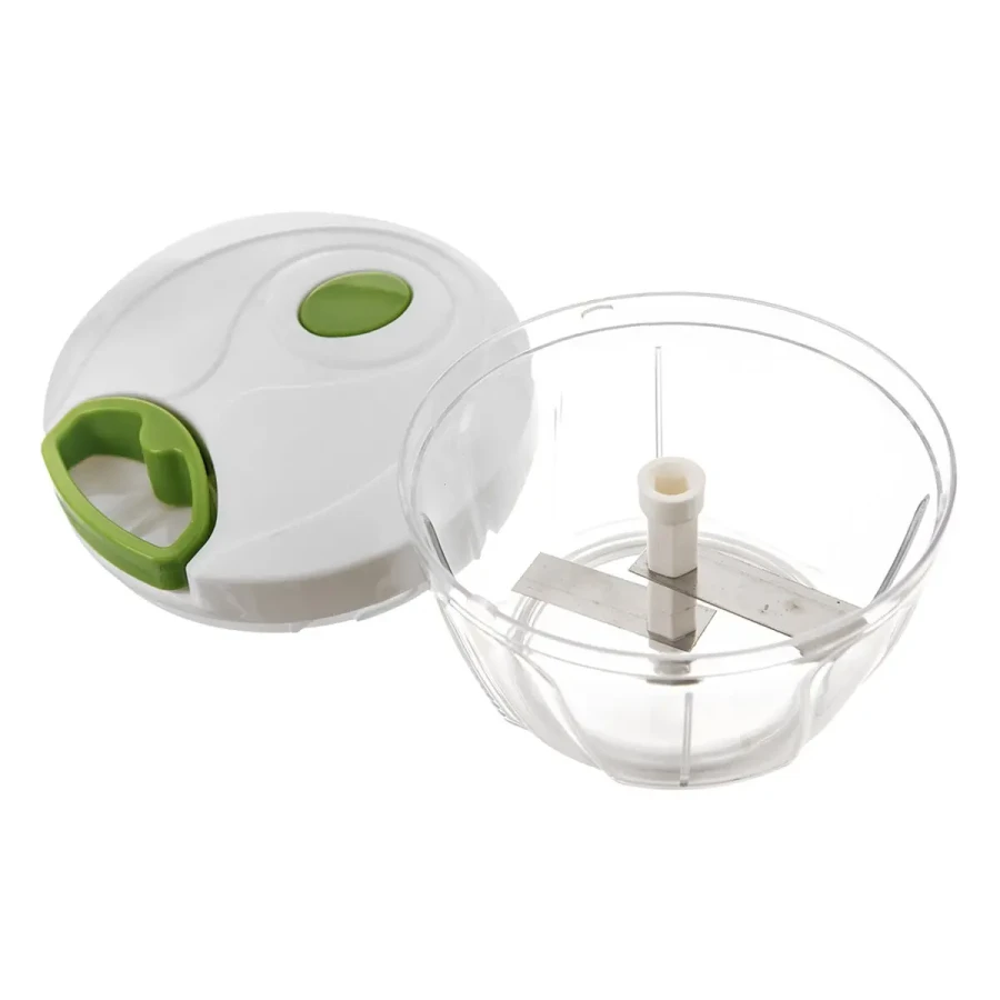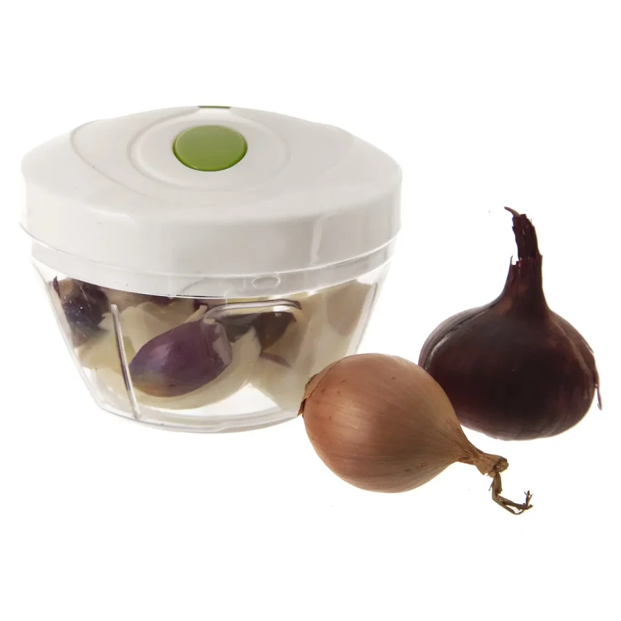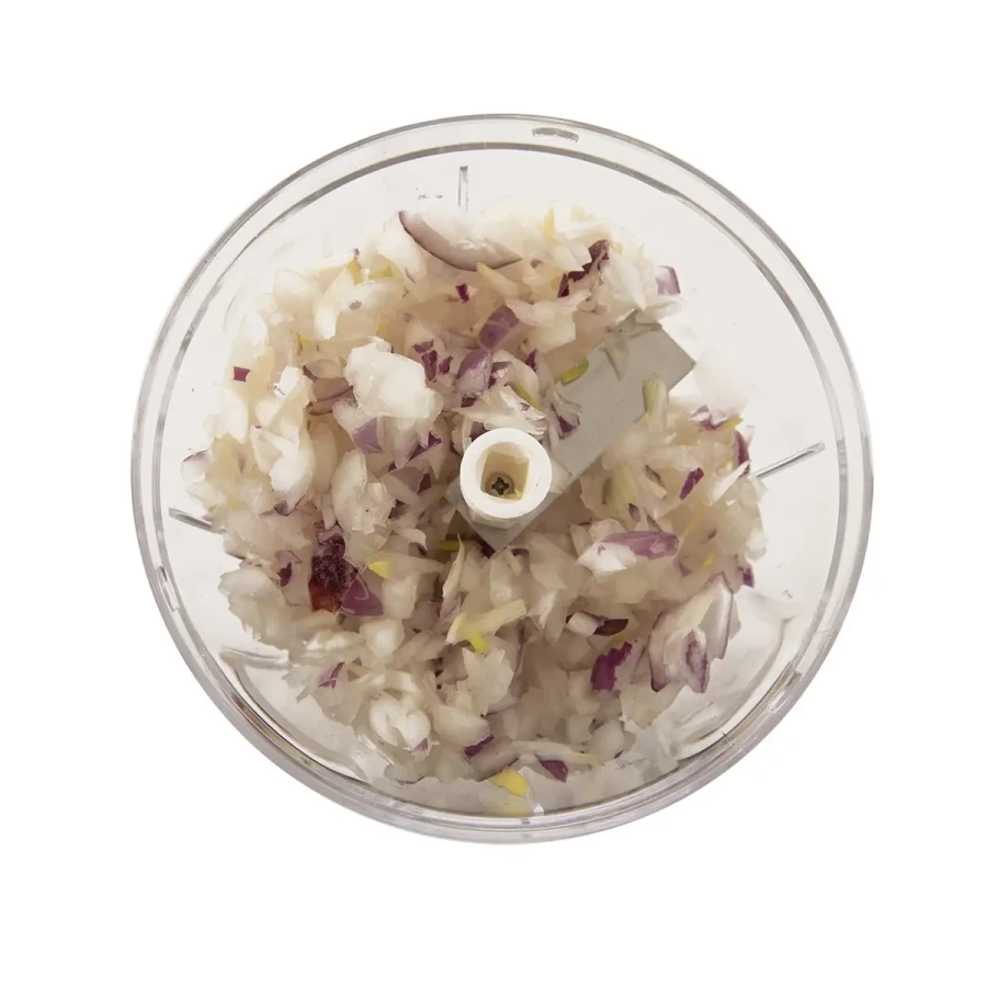 Stačí cibuľu (alebo inú zeleninu) nakrájať na menšie kúsky, vložiť do krájača a niekoľkokrát zatiahnuť za tiahlo. Výsledkom sú rovnomerné kúsky pripravené do šalátov, polievok či nátierok.