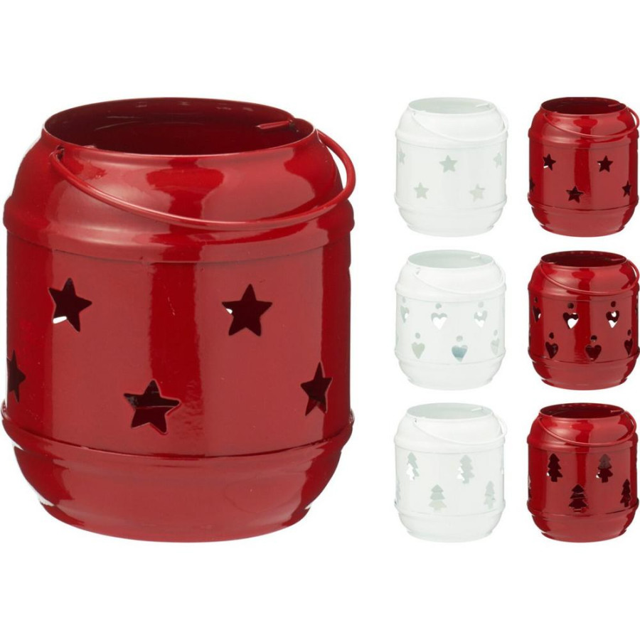 lampáš, svietnik, s rúčkou, materiál kov, 7,5x7,5x8,5 cm, červený/biely, dizajn hviezda/srdce/stromček