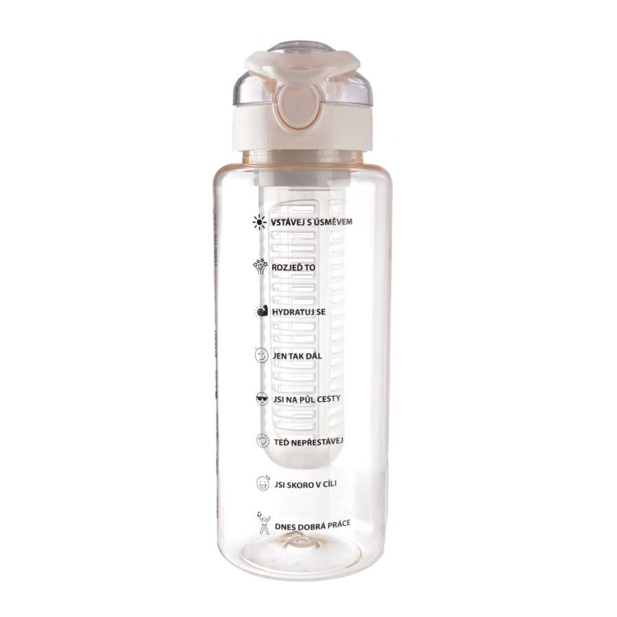 Fľaša s náustkom, filtrom na ovocie a bylinky, viečkom a uchom na zavesenie. Vhodná do školy, na výlet, na šport, na studené aj teplé nápoje… Do filtra môžete vložiť citrusové ovocie, mätu, medovku, uhorku… Nápoj bude ochutený, osviežujúci, ale piť budete čisté nápoje bez dužiny, lístkov… Dekor s vyznačenou motivačnou odmerkou vám zaručí dodržiavanie pitného režimu. Vďaka nej vypijete dostatok tekutín počas dňa a to priebežne. Materiál: plast tritan, plast PP (infuzér), silikón (tesnenie). Rozmery: celkový objem 1 l, objem pri využití vkladu 0,9 l (závisí od miery naplnenia infuzéru, či ovocím alebo bylinkami), pr. 8,5 cm, v. 24 cm. Plast TRITAN nielenže neobsahuje plastifikátory, ale má aj množstvo iných výhod, ktoré z neho robia populárnu náhradu skla. Je vysoko odolný voči nárazom, takže je vhodný nielen na každodenné použitie napríklad do školy, do práce či na turistiku, obdivuhodná je jeho priehľadnosť a čistota materiálu, ľahkosť, nepreberá žiadne chute ani vône, vydrží nízke aj vysoké teploty, môže sa umývať v umývačke na riad teda je ľahká údržba, a predovšetkým neobsahuje žiadne zdraviu škodlivé látky, zodpovedá požiadavkám na ochranu životného prostredia a FDA (Úrad pre kontrolu potravín a liečiv). Neobsahuje BPA – materiál Tritan neobsahuje bisfenol A, je zdravotne nezávadný, vhodný pre detské výrobky. Krištáľovo čistý – priepustnosť svetla je väčšia ako 90 %. Výborná rázová húževnatosť – odolný proti nárazom, vysoká pevnosť. Vynikajúca chemická odolnosť – nepreberá chute ani vône, môže odolať pracím prostriedkom, detergentom, uhľovodíkovým rozpúšťadlám, olejom. Veľká odolnosť voči teplotám – použitie od -10 °C do +95 °C – tritan je možné umývať v umývačke riadu (bez viečka a filtra), avšak nie je vhodný na použitie v mikrovlnnej rúre a mrazničke. Nízka váha – ideálna na cesty, do školy – na každodenné použitie.