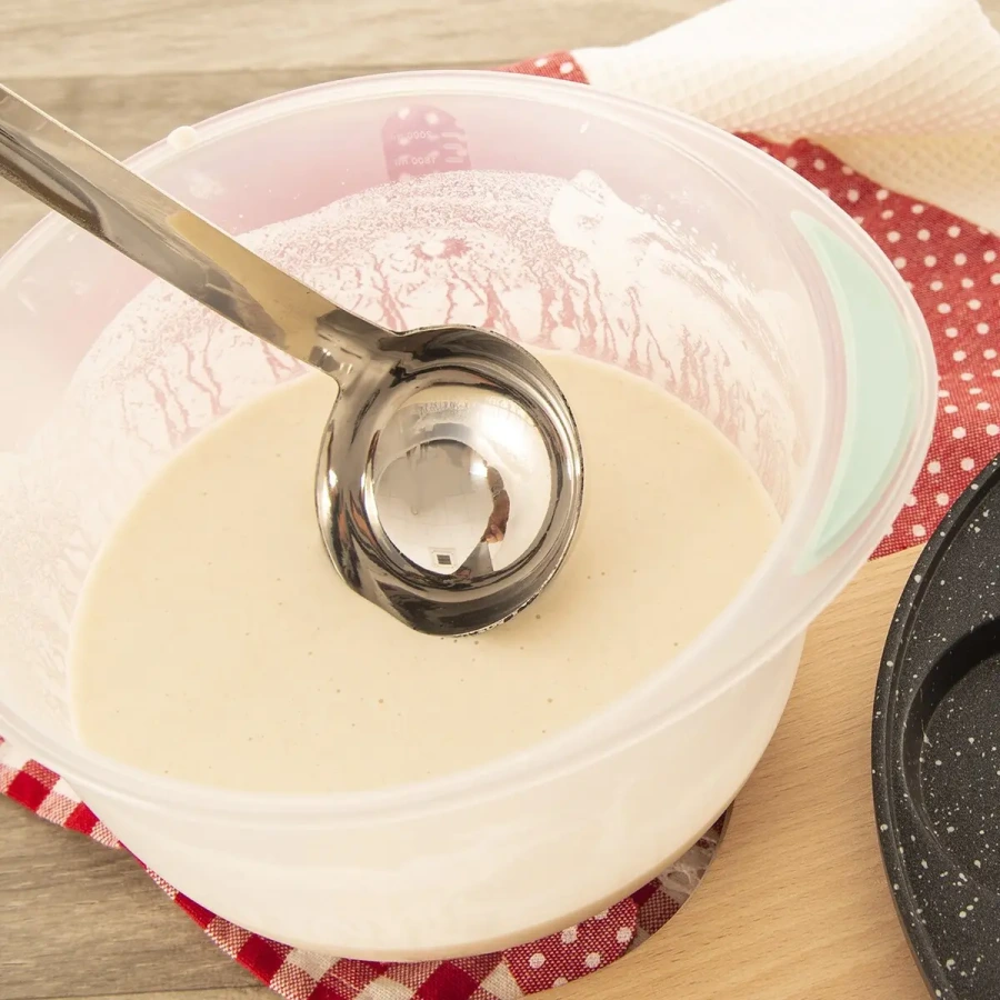 Áno – je ideálny pre polievky, omáčky aj tekuté zmesi, ponúka presné a kontrolované naberanie.