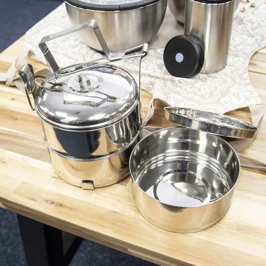 Elegantný a praktický nerezový obedár s tromi miskami o objeme 1,3 l – ideálny na prenášanie, skladovanie aj servírovanie jedál doma, v práci či na cestách.