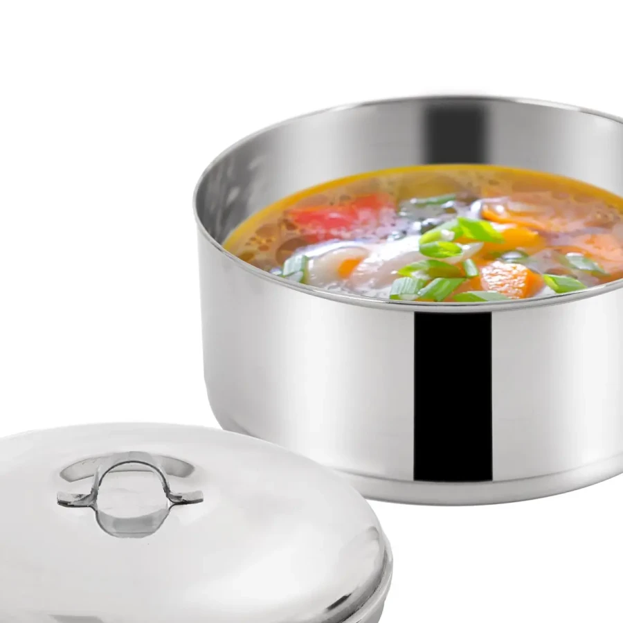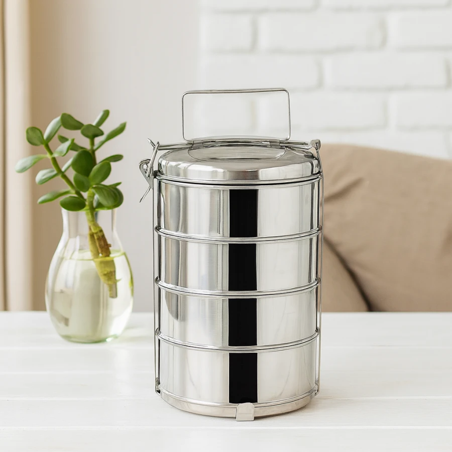 Elegantný a odolný obedár z kvalitnej nerezovej ocele s kapacitou 4× 1 l. Perfektný na polievku, hlavné jedlo, prílohu aj dezert – vhodný do práce, školy, na cesty aj na použitie doma.