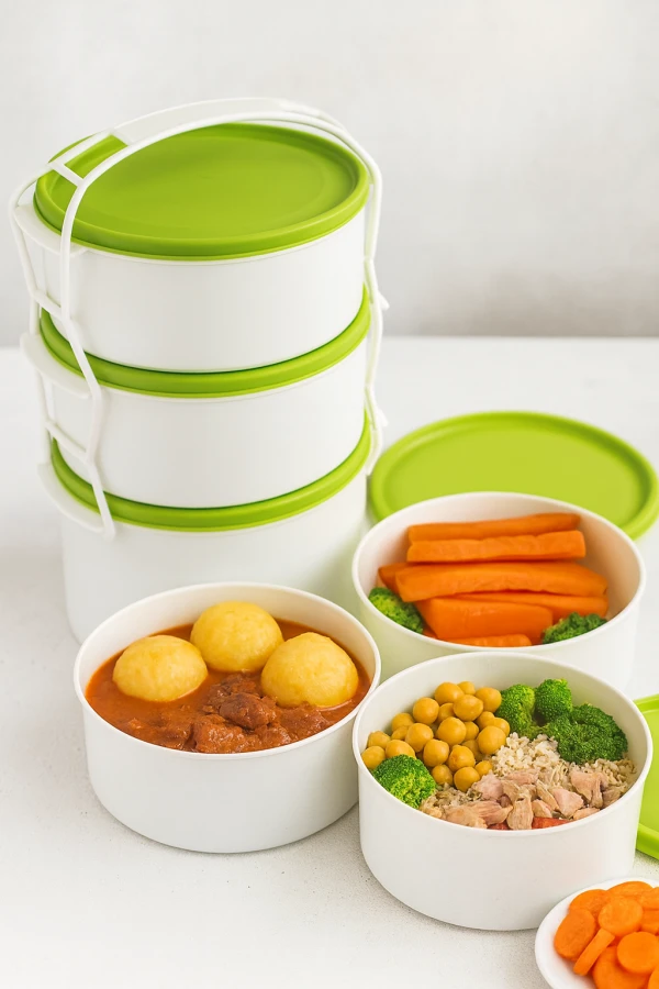 Plastový 4-dielny obedár s objemom 3× 1,2 l + 1× 2 l (celkovo 5,6 l) je dokonalým riešením na každodenné prenášanie a skladovanie jedál. Vďaka štyrom oddeleným komorám zostanú vaše pokrmy vždy čerstvé a bez miešania chutí.