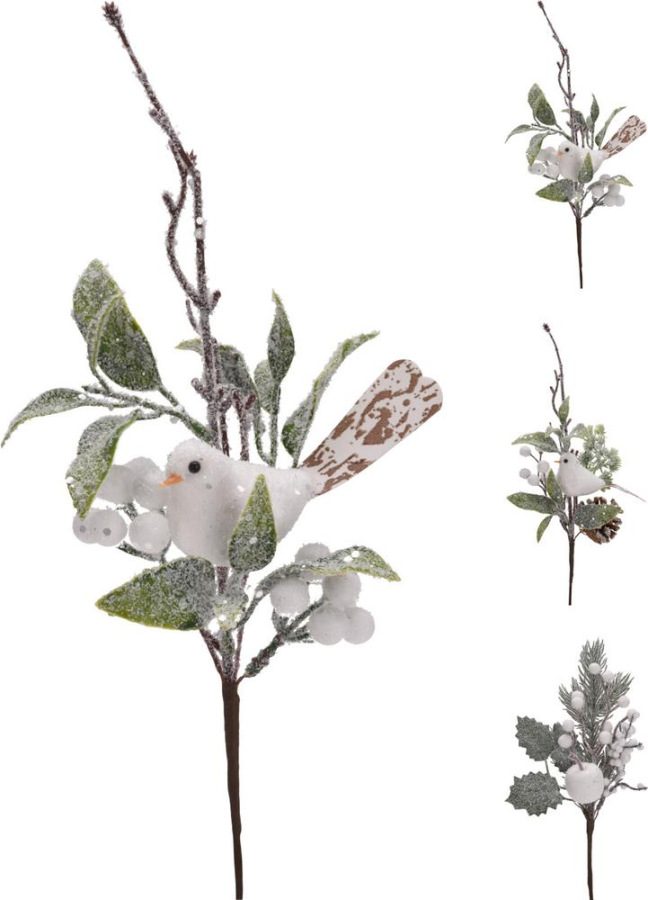 zapichovacia ozdoba, dekorácia, vetvička so šiškou alebo vtáčikom, materiál kov/plast/polyfoam, rozmer 8x17x35 cm, biela, mix