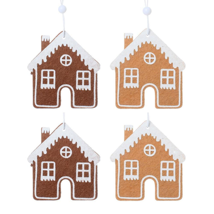 závesná ozdoba domček, dekor perník, materiál textil, sada 4 kusov, rozmery 12x1,5x16 cm, farba hnedá mix
