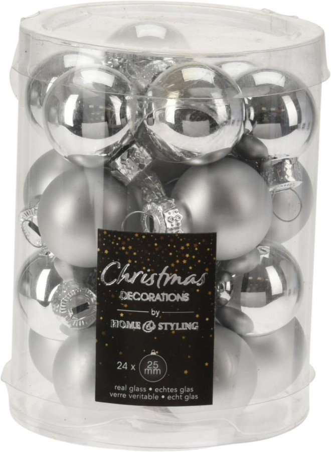 závesná ozdoba, dekorácia, vianočná guľa, materiál sklo, priemer 2,5 cm, sada 24 ks - 12x lesklá, 12x matná, strieborná, mix