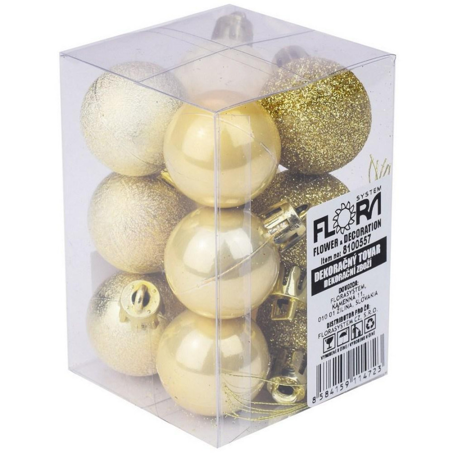 závesná ozdoba, dekorácia, vianočná guľa, materiál plast, priemer 3 cm, sada 12 ks, zlatá, mix