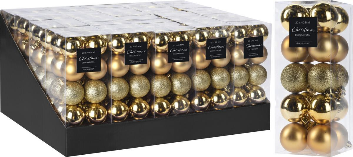 závesná ozdoba, dekorácia, vianočná guľa, materiál plast, priemer 4 cm, sada 20 ks - 8x lesklá, 8x matná, 4x gliter, zlatá, mix