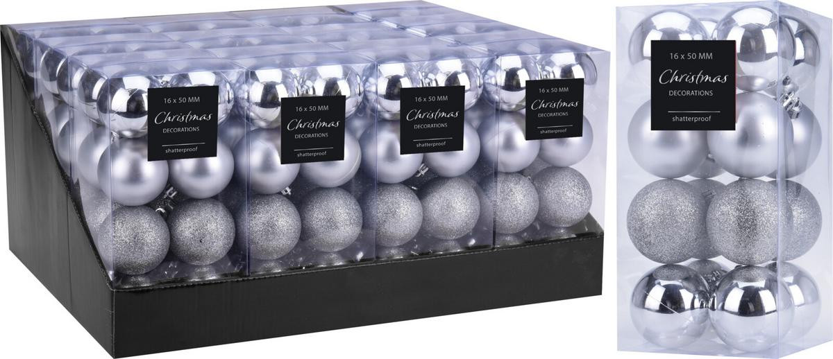 závesná ozdoba, dekorácia, vianočná guľa, materiál plast, priemer 5 cm, sada 16 ks - 8x lesklá, 4x matná, 4x gliter, strieborná, mix
