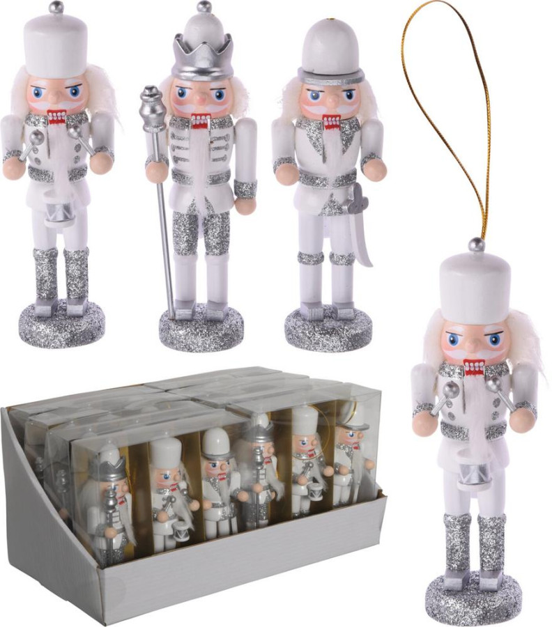 Ozdoba závesná luskáčik/vojačik 4x3x12,5 cm sada 3 ks drevo bielo-strieborný mix