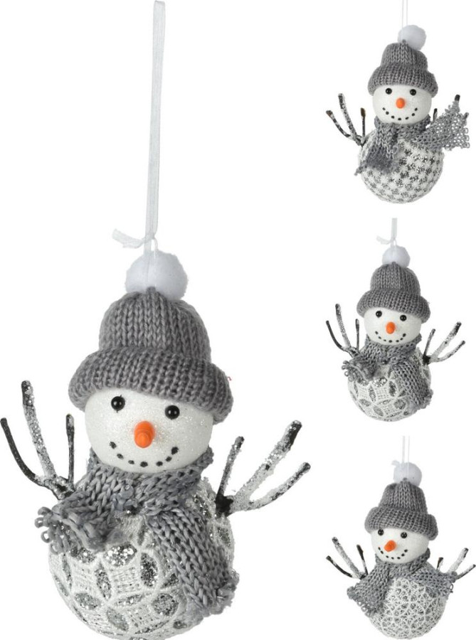 Ozdoba závesná snehuliak 12x6,5x12 cm polyfoam/polyester strieborný mix