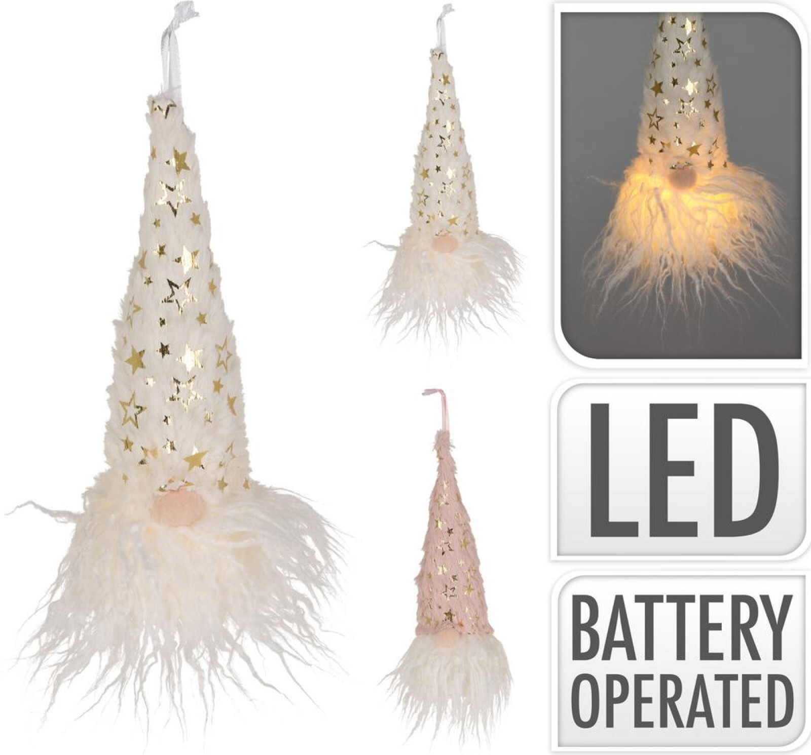vianočná dekorácia, postavička, trpaslík, s LED svetlom, materiál polyester, rozmer 6x6x20 cm, na batérie 3x LR1130 (súčasťou), krémový/ružový, mix