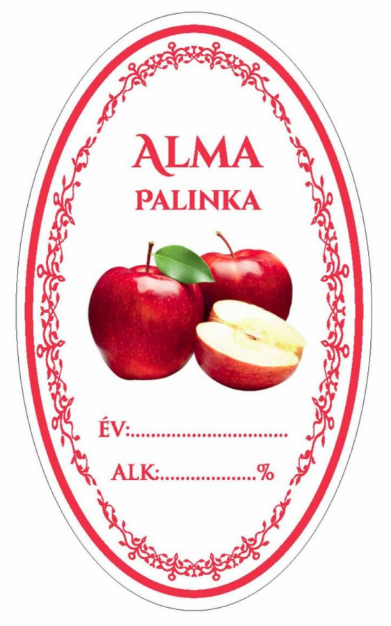 oválny tvar, výška 10cm, šírka 6 cm, balenie obsahuje 16ks etikiet s maďarským názvom ALMA PALINKA (Jablkovica)