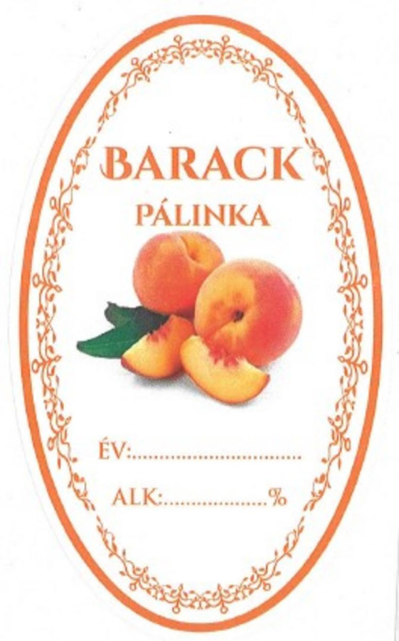 oválny tvar, výška 10cm, šírka 6 cm, balenie obsahuje 16ks etikiet s maďarským názvom BARACK PÁLINKA (Broskyňovica)