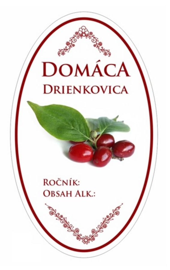 oválny tvar, výška 10cm, šírka 6 cm, farebná potlač s drienkami, balenie obsahuje 16ks etikiet s názvom Drienkovica, samolepiace etikety na fľaše, samolepky na drienkovicu