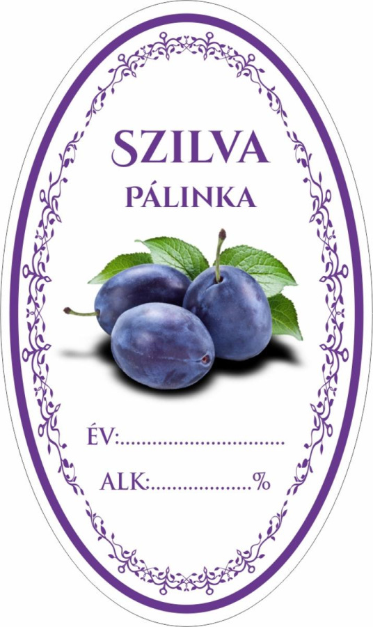 oválny tvar, výška 10cm, šírka 6 cm, balenie obsahuje 16ks etikiet s maďarským názvom SZILVA PALINKA (Slivovica)