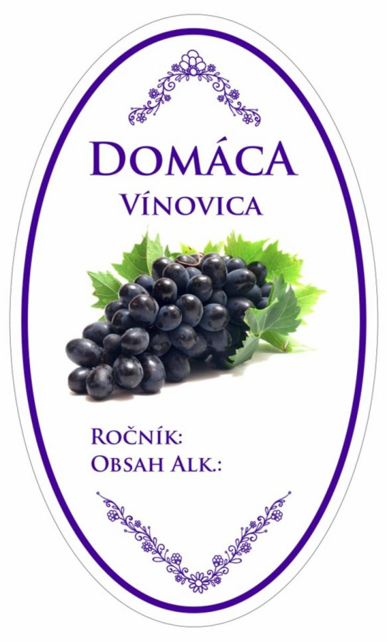 oválny tvar, výška 10cm, šírka 6 cm, farebná potlač s hroznom, balenie obsahuje 16ks etikiet s názvom Vínovica