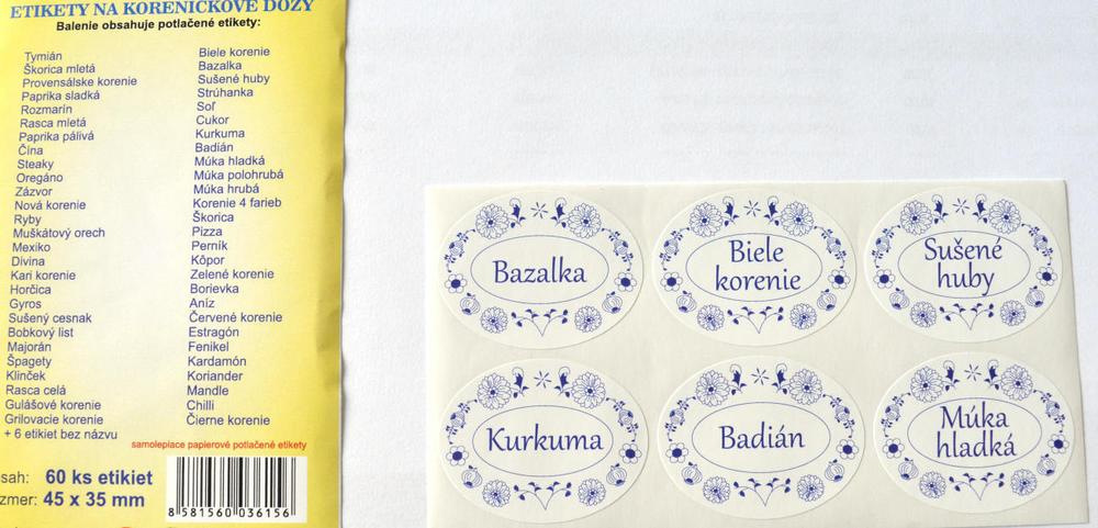 oválny tvar, šírka 4,5 cm, výška 3,5 cm, balenie obsahuje 60ks etikiet s názvom rôznych korení, byliniek a pod., farba etikety bielo-modrá