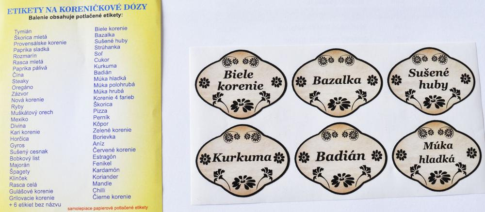 oválny tvar, šírka 4,5 cm, výška 3,5 cm, balenie obsahuje 60ks etikiet s názvom rôznych korení, byliniek a pod., farba etikety hnedé drevo