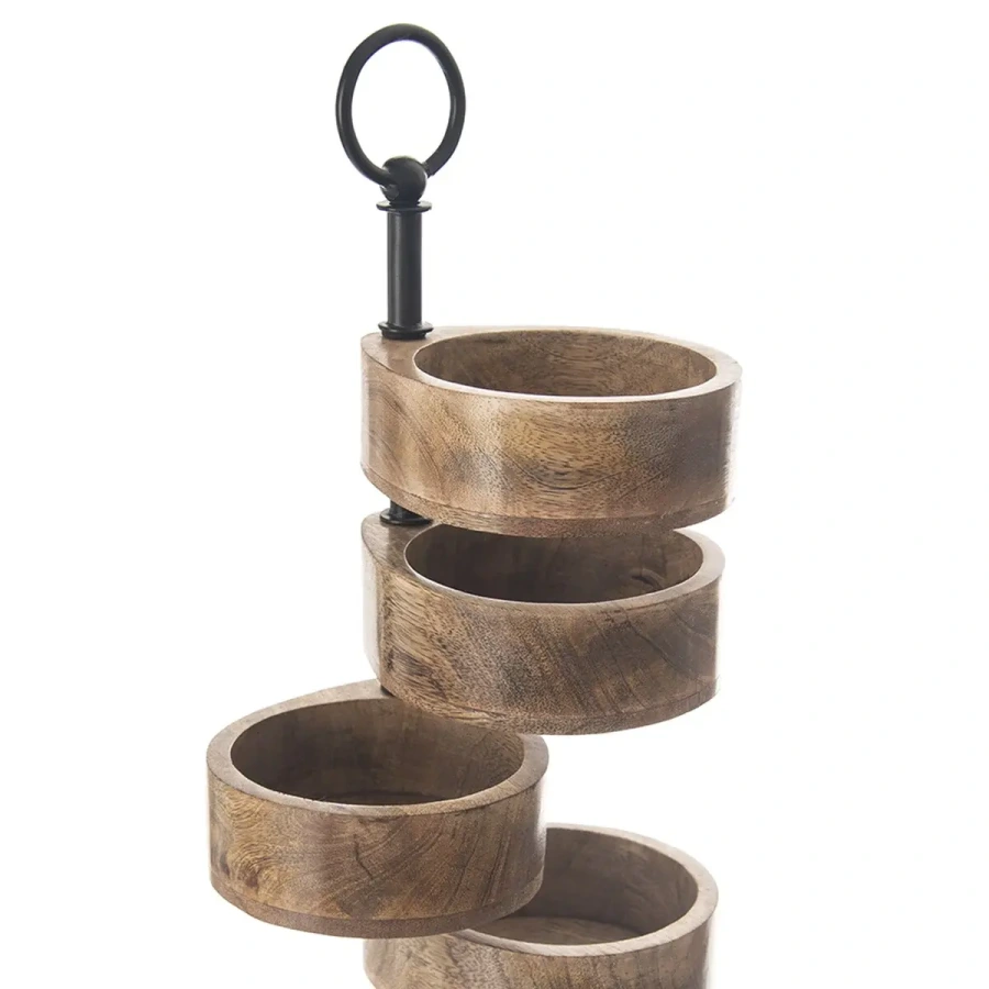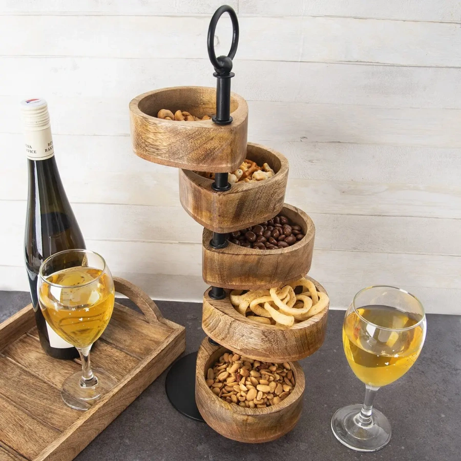 Tento 5-poschodový servírovací stojan z mangového dreva je dokonalý na oriešky, sušené ovocie, cukríky, sušienky, mini snacky aj čipsy. Vďaka kombinácii prírodného dreva a kovu pôsobí mimoriadne elegantne, zaujme každého hosťa a prakticky šetri miesto na stole.