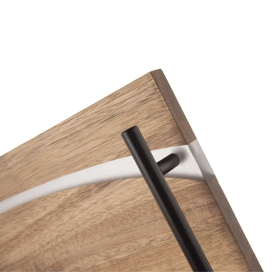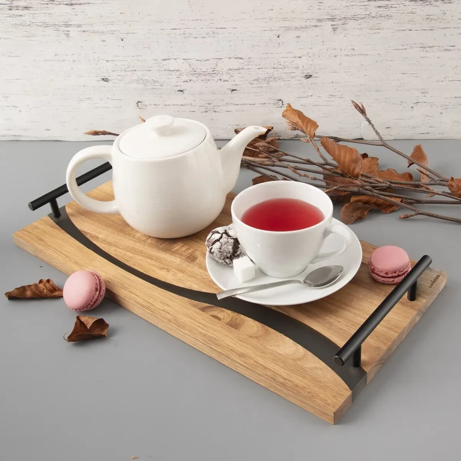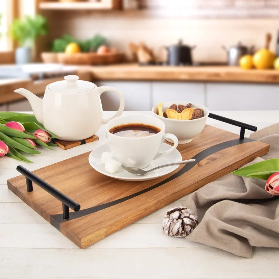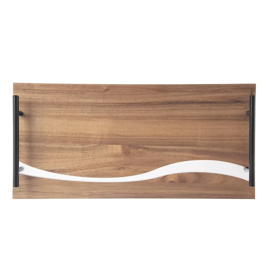 Elegantná servírovacia tácka z kolekcie RIVER je jedinečným dizajnovým kúskom, ktorý kombinuje prírodnú krásu akáciového dreva s moderným prvkom živice v tvare plynúcej rieky. Kovové úchyty zabezpečujú pohodlné prenášanie a dodávajú tácke robustnosť. Táto originálna tácka je nielen praktická, ale aj estetickým doplnkom, ktorý vynikne v každom interiéri.