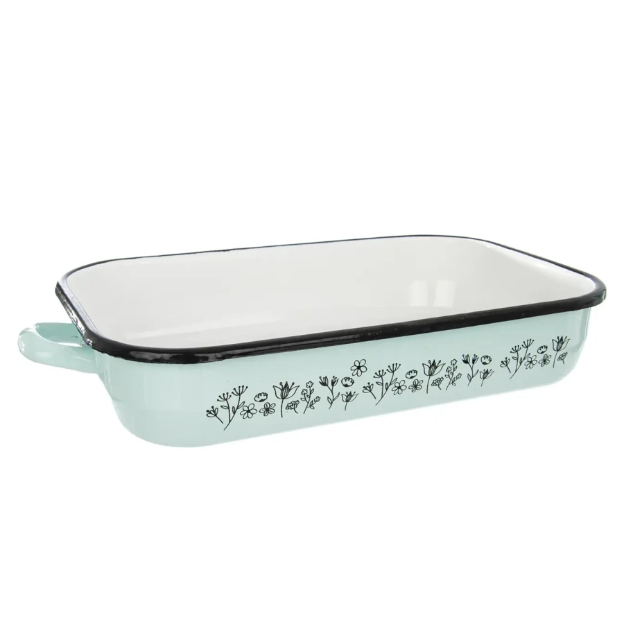 Smaltovaný pekáč s ušami – Zelená, dekor LÚKA spája praktickosť a estetiku. Vďaka odolnému smaltovanému povrchu pripravíte pečené mäso, zeleninu, buchty či koláče bez pripaľovania a s minimálnym množstvom tuku.