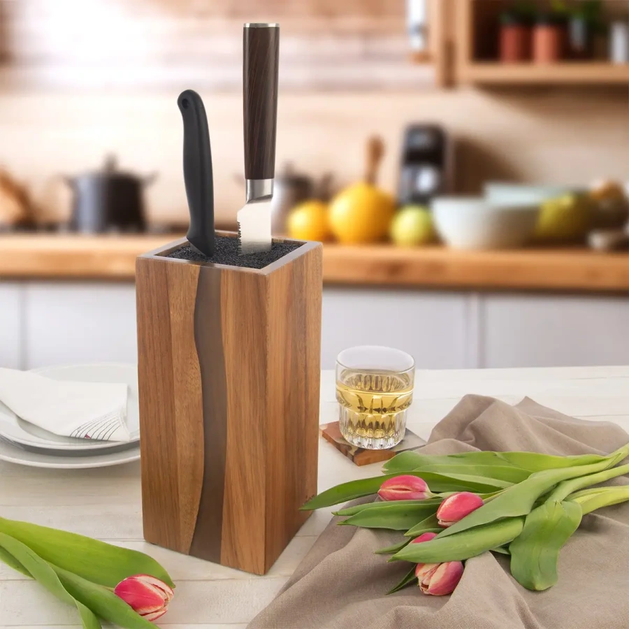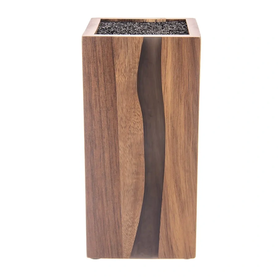 Stojan na nože RIVER – akáciové drevo a živica (10,5 × 11 × 23 cm)