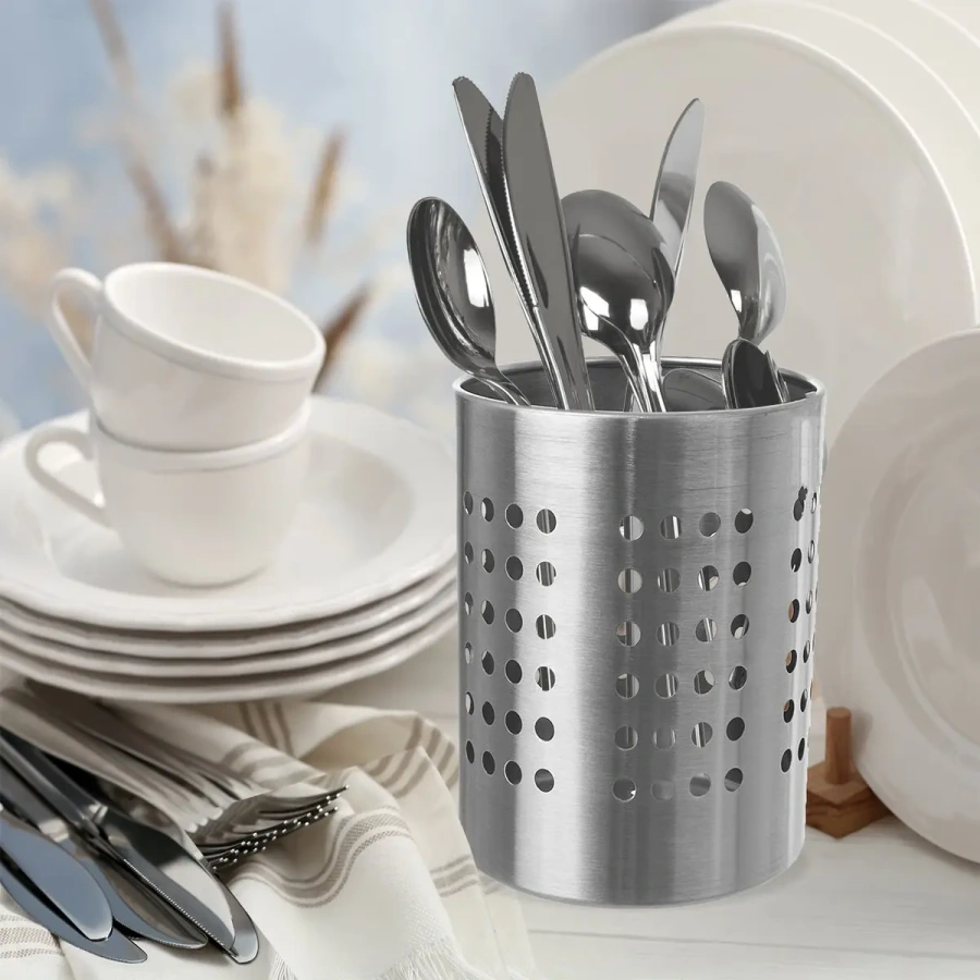 Tento nerezový stojan na príbory je ideálny pre každého, kto chce mať svoje vidličky, lyžice, nože aj kuchynské náradie prehľadne usporiadané. Vďaka otvorom po obvode aj na dne slúži zároveň ako odkvapkávač, ktorý umožňuje príbory rýchlo, hygienicky a prirodzene vysušiť bez utierania.