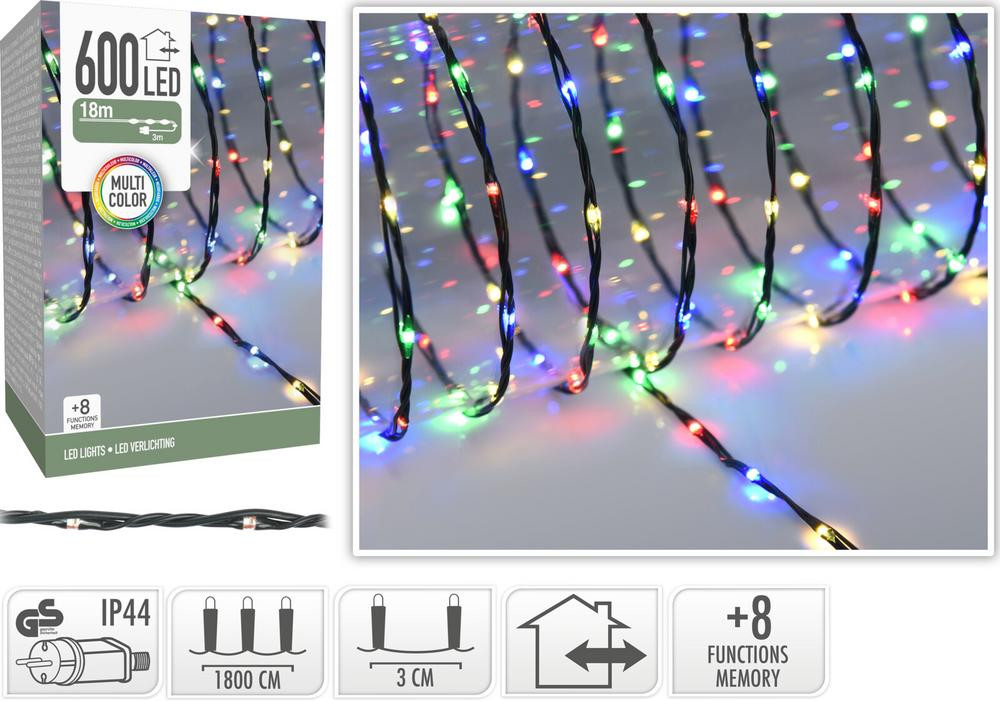 vianočné svetlo, svetelná reťaz, 600 LED farebné, zelený kábel, dĺžka svetelnej časti 18 m, dĺžka prívodného kábla 3 m, vzdialenosť medzi žiarovkami 3 cm, s 8 funkciami a pamäťou, IP44 - na vonkajšie/vnútorné použitie