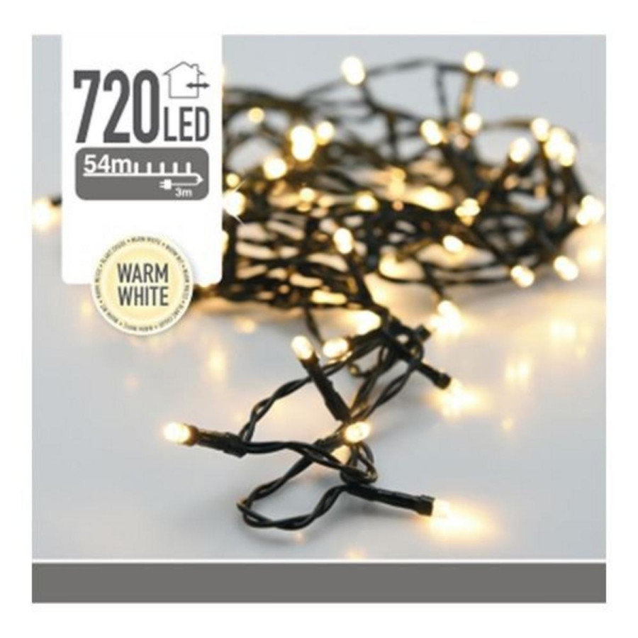 vianočné svetlo, svetelná reťaz, 720 LED teplé biele, zelený kábel, dĺžka svetelnej časti 54 m, priemer žiarovky 5 mm, dĺžka prívodného kábla 3 m, vzdialenosť medzi žiarovkami 7,5 cm, IP44 - na vonkajšie/vnútorné použitie