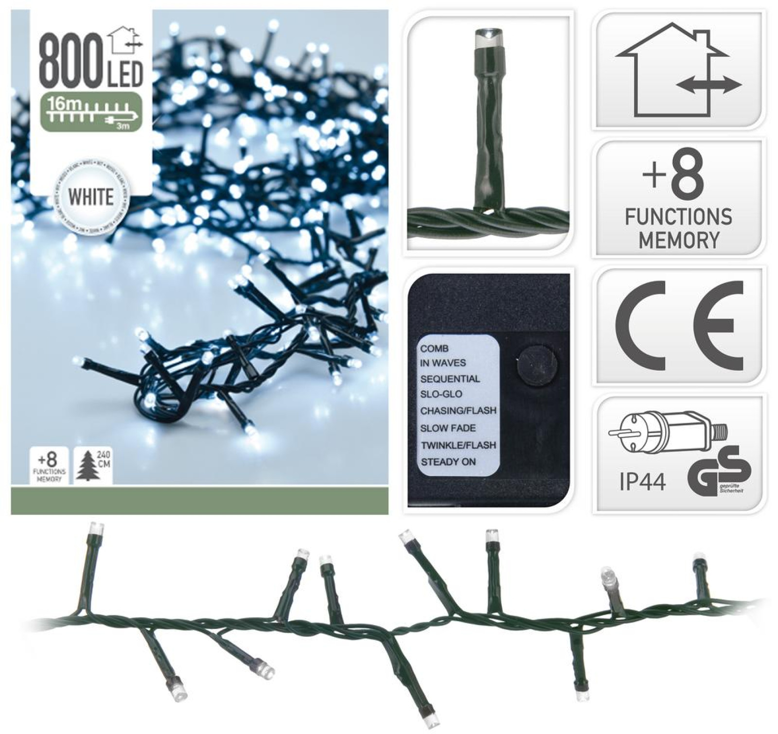 vianočné svetlo, svetelná reťaz, 800 LED studené biele, zelený kábel, dĺžka svetelnej časti 16 m, priemer žiarovky 5 mm, dĺžka prívodného kábla 3 m, vzdialenosť medzi žiarovkami 2 cm, s 8 funkciami a pamäťou, vhodné na 240 cm vianočný stromček, IP44 - na vonkajšie/vnútorné použitie