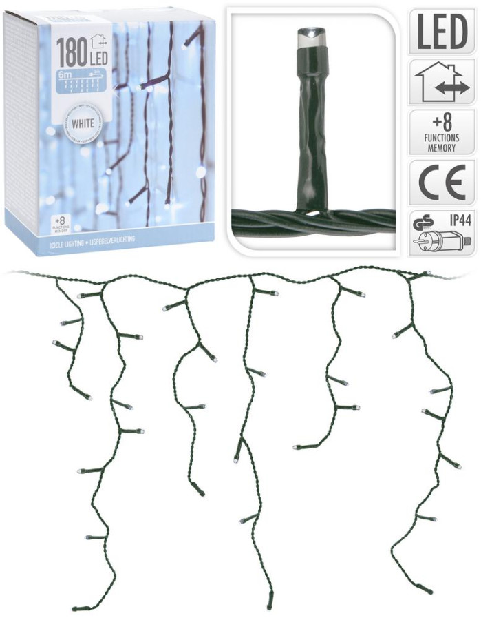 vianočné svetlo, svetelná reťaz, cencúle, záves, 180 LED studené biele, zelený kábel, rozmer svetelnej časti 600x52 cm, priemer žiarovky 5 mm, dĺžka prívodného kábla 3 m, vzdialenosť medzi žiarovkami 15 cm, s 8 funkciami a pamäťou, IP44 - na vonkajšie/vnútorné použitie