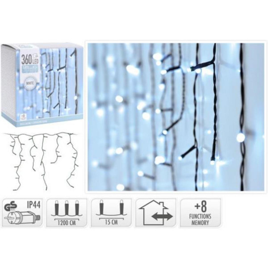 vianočné svetlo, svetelná reťaz, cencúle, záves, 360 LED studené biele, zelený kábel, rozmer svetelnej časti 1200x52 cm, priemer žiarovky 5 mm, dĺžka prívodného káblu 3 m, vzdialenosť medzi žiarovkami 15 cm, s časovačom 8 hodín zapnuté, 16 hodín vypnuté, s 8 funkciami a pamäťou, IP44 - na vonkajšie/vnútorné použitie