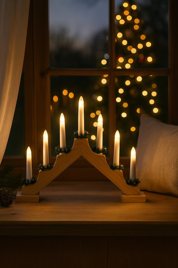 Svietnik vianočný 7 LED sviečok 39,5x5x31 cm, s časovačom, drevo